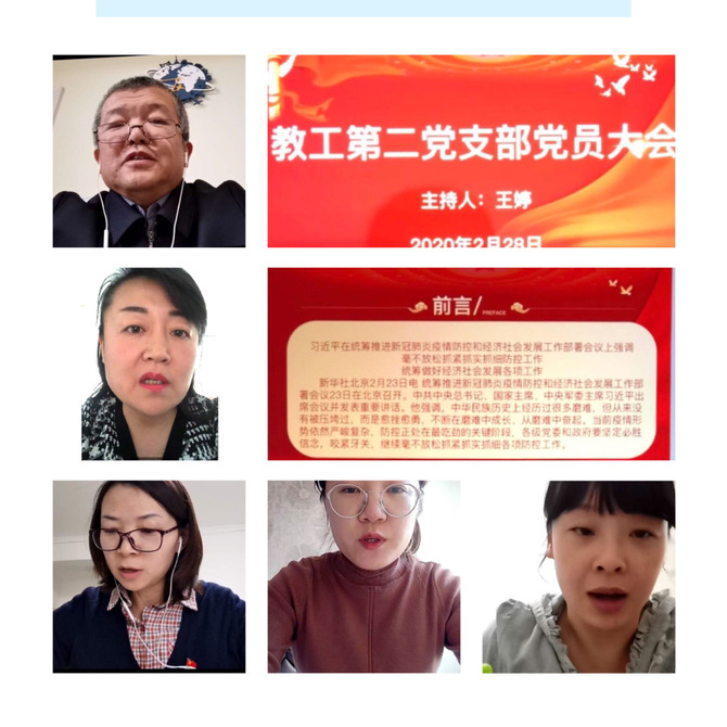 2020年2月28日下午6:00,lol电竞比分网 教工第二党支部召开了一次网络视频会议。本次会议围绕习近平总书记2月23日在统筹推进新冠肺炎疫情防控和经济社会发展工作部署会议上的讲话,以学讲话、谈体会为形式,认真领会讲话精神,结合学习感受和自身工作等进行了积极踊跃的发言。其中,柴芸和杨晓丽表达了党员们不忘初心、牢记使命的决心,冯娟和徐梅谈到作为“三进两联一交友”老师和班主任对学生的关心关爱,史晓薇赞叹了90后参与志愿者活动的学生成为了同学们的榜样,刘海杰和李明霞谈到了积极响应脱贫攻坚战的工作部署,闫兴红和迪丽胡玛尔就习近平总书记的绿水青山就是金山银山和保护野生动物联系在了一起,阿丽亚和陈蓓表达了对在一线医护人员的付出的敬佩,何剑利和黄璐谈到了目前的停课不停学工作。常光辉从六个方面总结了习近平总书记的讲话,表示这次疫情是一次危机也是一场对党员的考验,就目前党员服务工作队、网络授课、学工工作等给予了赞扬。最后,支部书记王婷做了总结发言,并嘱咐大家安顿好自己的小家,安排好自己的教学,此外她对近期支部的三会一课工作也做出了安排和计划。作为结束语,她说相信一定会春暖花开。