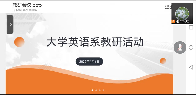 在3月初的第一次教研活动中,大家就曾针对学生线上自主学习SPOC课程的问题在管理和体会方面各抒己见,大学英语系主任王婷老师也提出了以“英语短视频大赛”的形式来传播中华优秀传统文化,讲好中国故事,促进课堂教学活动并丰富第二课堂的想法。这两次教研活动将积极推进大学英语短视频大赛的筹备工作。
