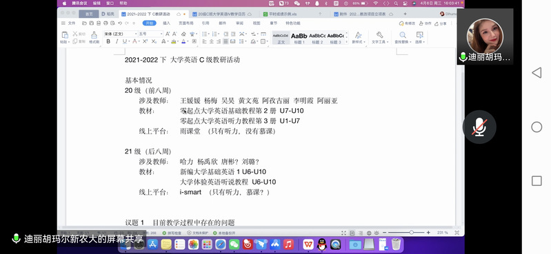 会议一开始,由C级课程组长迪丽胡玛尔老师介绍了20、21级C班教学基本情况,包括教材及线上平台的选择、平时成绩的安排、教学过程中有待解决的问题、课程建设与教师教研教改课题的结合等。她说到,因为适合C级学生的教材偏少,线上平台更少,所以C级的老师们很辛苦,只能通过将听力课本内容制作成雨课件,上传至雨课堂,给学生提供线上资源。此外,迪丽老师说到申报校级教研教改课题,课程组组成三个小分队,分别就C级大学英语教学申报教学质量提升项目、第二课堂建设项目及学风教风建设项目三个方向,均已立项在研。