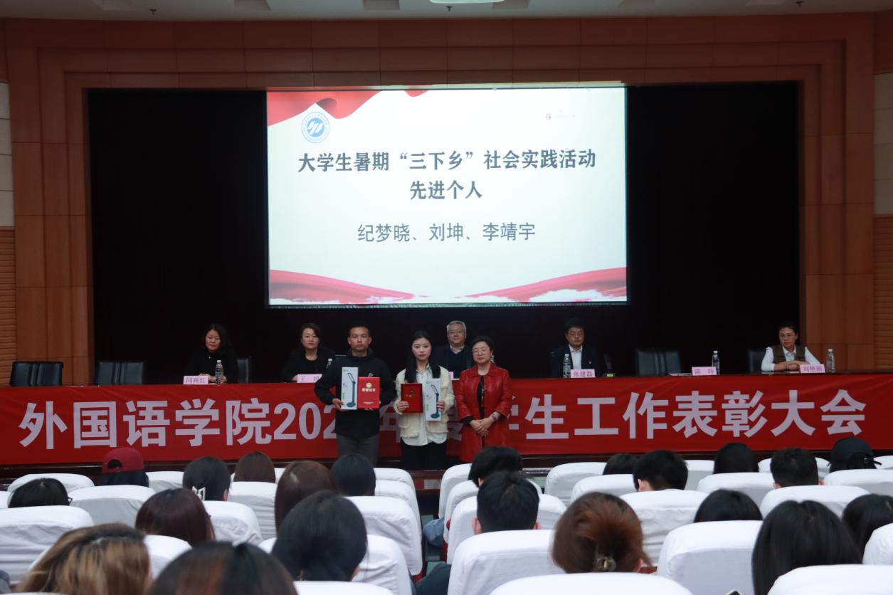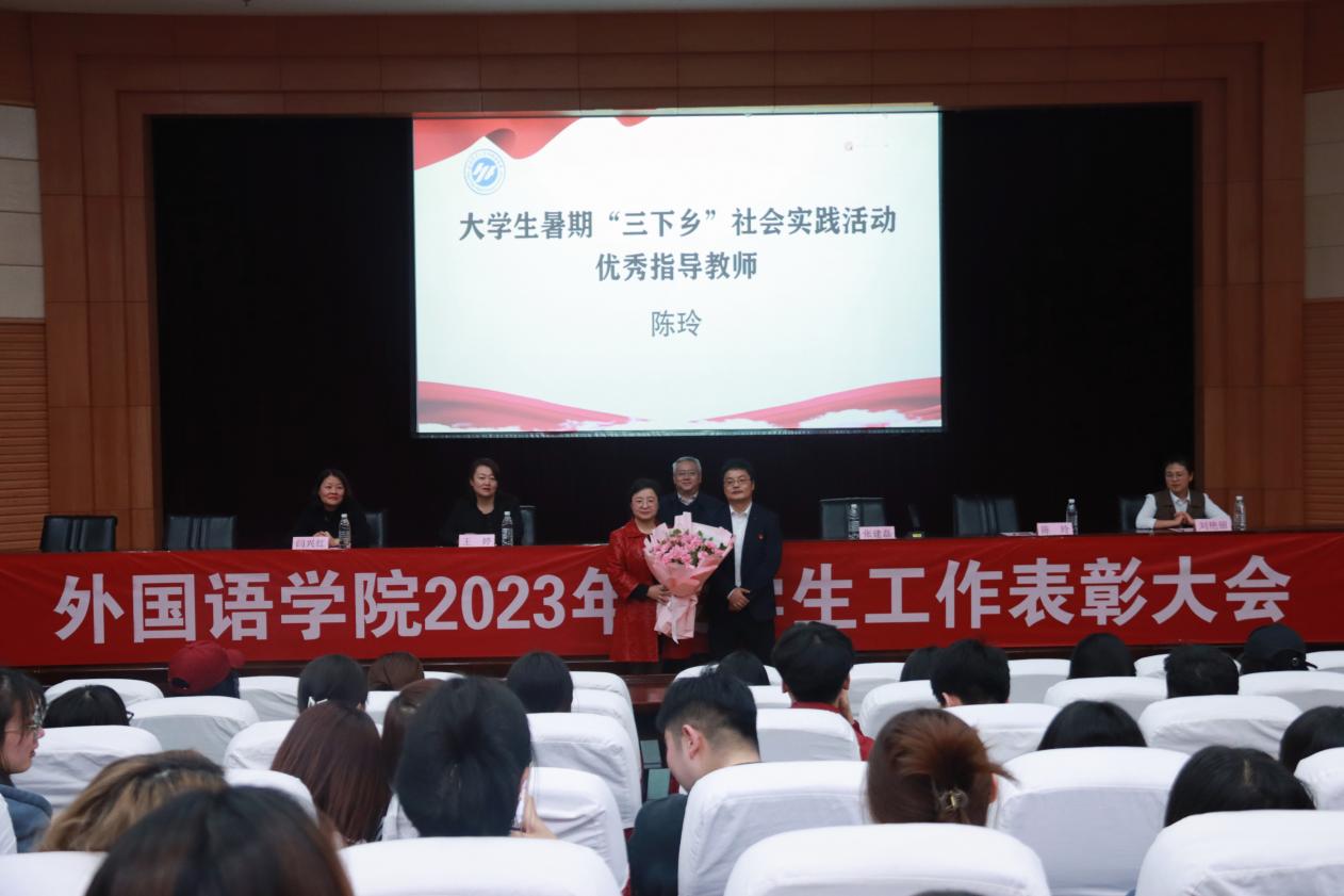 研究生英语系主任陈玲老师为“大学生暑期‘三下乡’社会实践活动先进个人”颁奖