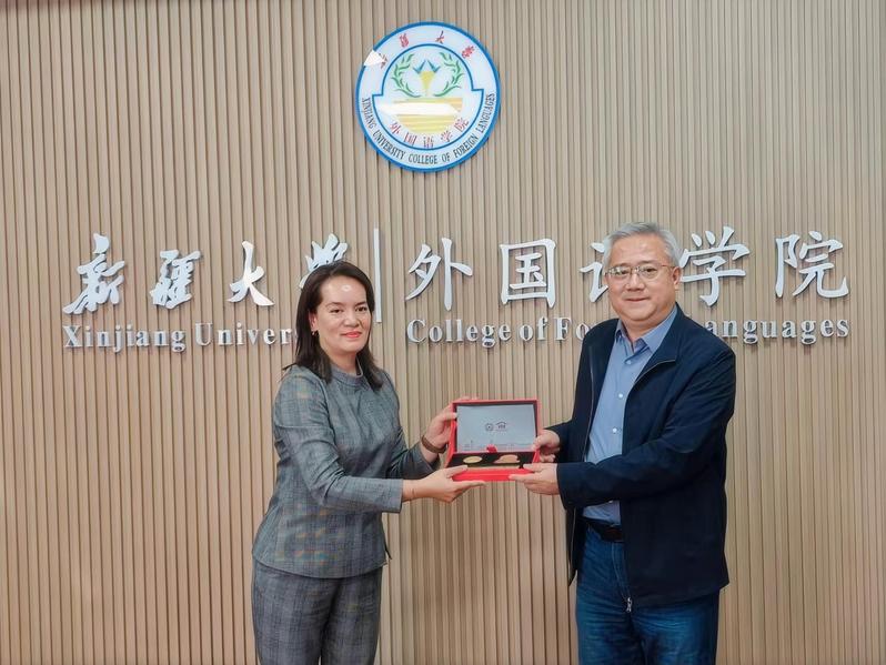 在活动中,电竞比分 向新疆大学lol电竞比分网 赠送了百年校庆祝贺牌匾,也收到了回赠的校庆纪念品。电竞比分 教师们获赠校友纪念品。两院教师们就优秀教师交流、推免研究生接收、“外语+专业”人才培养、基于“理解当代中国”系列教材的使用进行教科研合作等进行了深入的交流,旨在进一步落实党建和教学的深度融合。
