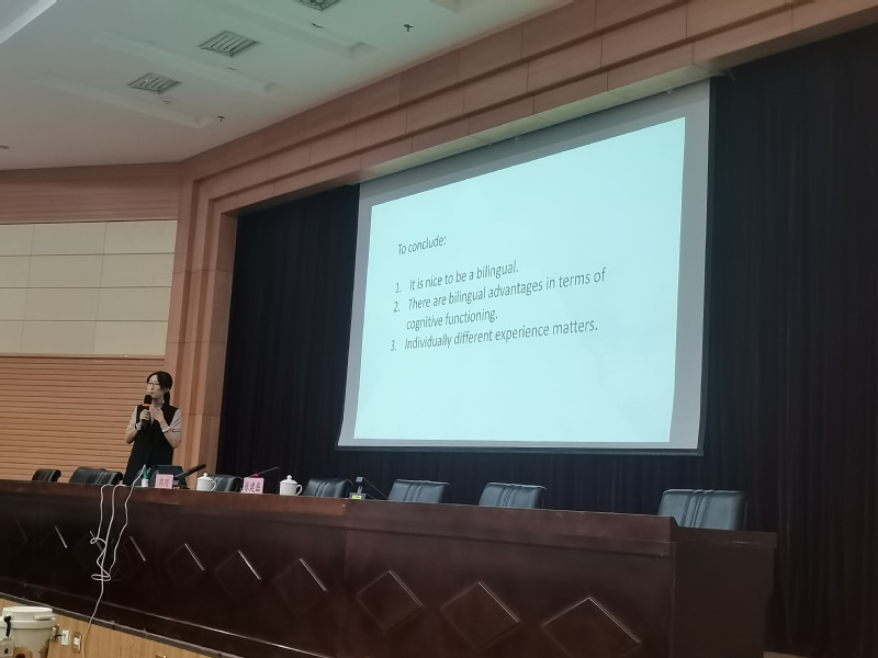 首先,郎玥教授用质朴的语言缓缓讲述着本次《双语者优势漫谈》的核心内容:在全球化日益加深的今天,双语者已经十分普遍,双语者不仅在语言处理上展现出独特的能力,更在思维方式和多任务处理等方面表现出显著的优势。其优势主要表现在:一、双语使用者能够更好地集中精力在有关的事务上,同时排除其他干扰。二、双语使用者很有可能有效地推迟老年痴呆症的发病时间。在分享中,郎教授还利用颜色认知游戏让全体师生更深地了解到双语优势在认知功能方面的作用。全场师生在轻松愉悦的气氛中加深了对双语者优势重要性的认识。