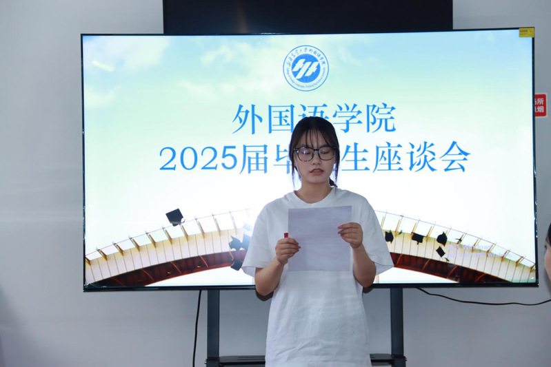 座谈会由学生会综合部负责人时凯瑜主持,有序介绍到会领导与老师,lol电竞比分网 研究生英语系系主任陈玲、大学英语系系主任唐彬以及2021级学生齐聚一堂,以爱与期待,开启这场关于青春与成长的对话。