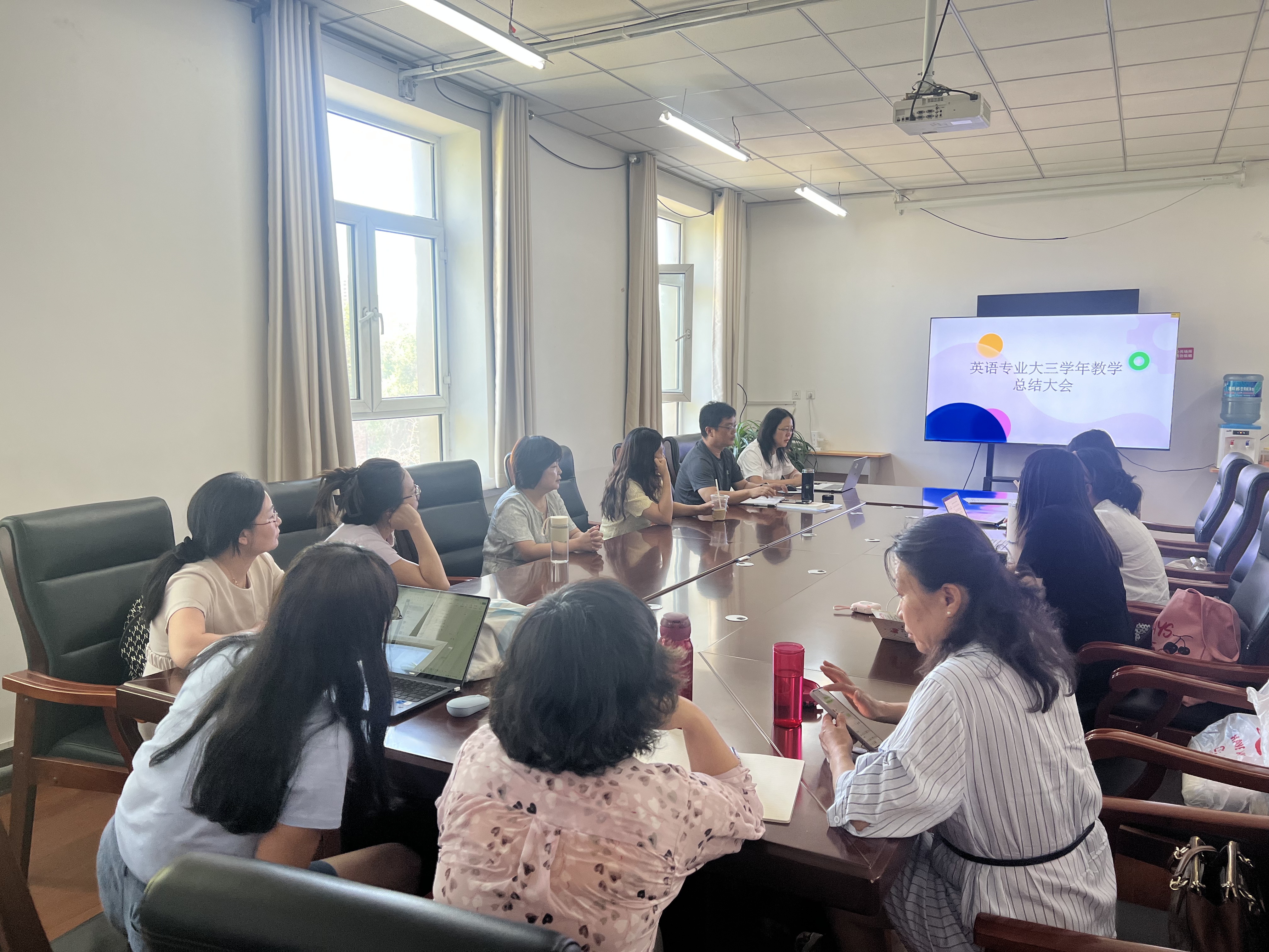 79日,英语专业大三年级召开本学期教学总结大会,大三年级全体任课教师参会。此次会议旨在全面总结大三年级英美文学、翻译课程、俄语、日语、高级英语课程的教学情况与成效,为下学年大四相关课程教学的有效衔接提供方案,夯实教学基础,提升育人质量。