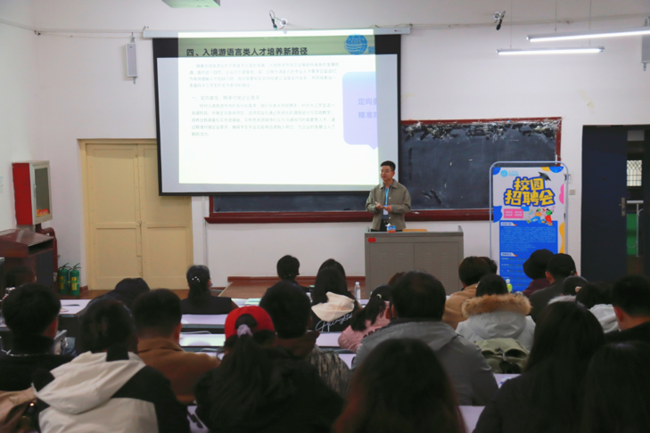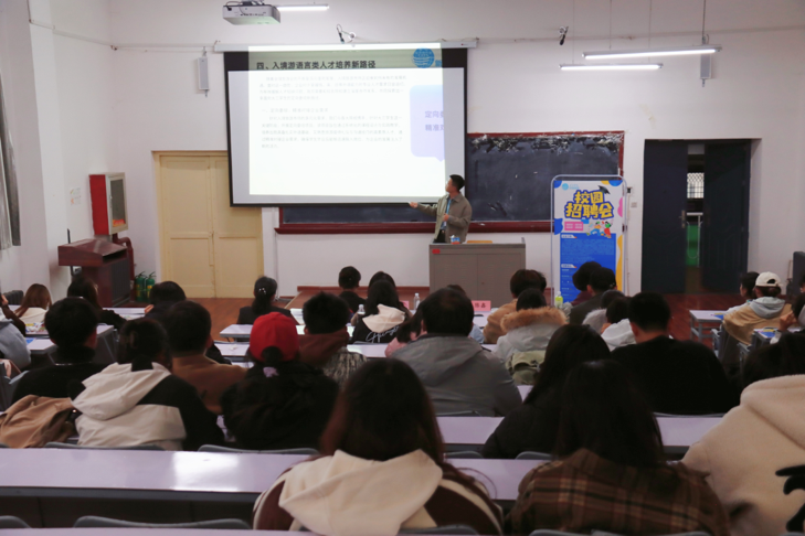 接着陈鑫老师为我们讲述到入境游语言类人才培养新路径、岗位职责及要求、发展平台与保障。陈鑫通过这三方面内容让同学们更好理解企业,帮助同学们毕业后更好融入社会,同时也更好地为企业注入新活力。