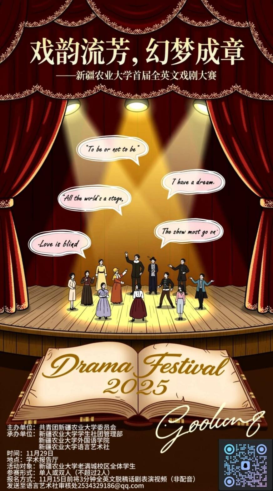 11月15日线上收片,20日公布决赛名单,29日报告厅终极对决。届时我们将以电话或短信通知每位决赛选手。参赛对象面向新疆农业大学老满城校区全体学生,无论你是专升本、本科还是研究生,只要你热爱英语、钟情舞台,校团委、社团管理部、lol电竞比分网 与语言艺术社已搭好聚光灯。11月29日,学术报告厅,让世界文化在你的台词里绚烂旋转!